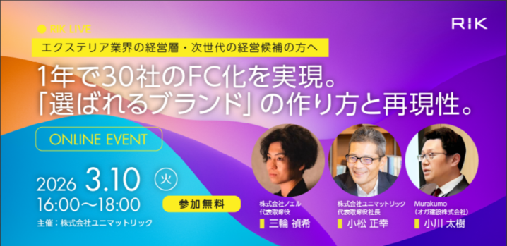 デザイン力とマーケティング力を掛け合わせ、短期間で事業をスケールさせた「経営の裏側」。そして、1年で30社のFC化を実現した「再現可能な仕組み」。 第2回となる今回は、マーケティングとFC展開という実績で証明した三輪代表の実例から、RIK未来塾が掲げる「再現可能な経営」を紐解きます。