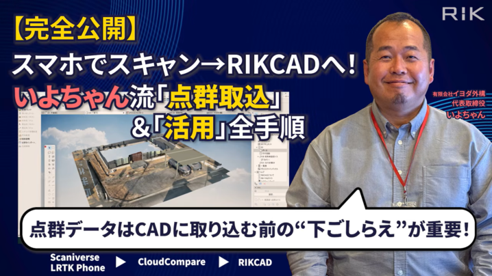 無料のスマホアプリScaniverse(スキャニバース)で取得した点群データをCloudCompare(クラウドコンペア)で整理・調整し、RIKCADへ取り込んで設計に活かすまでの一連の流れを、実際の画面とともに解説いただいています。