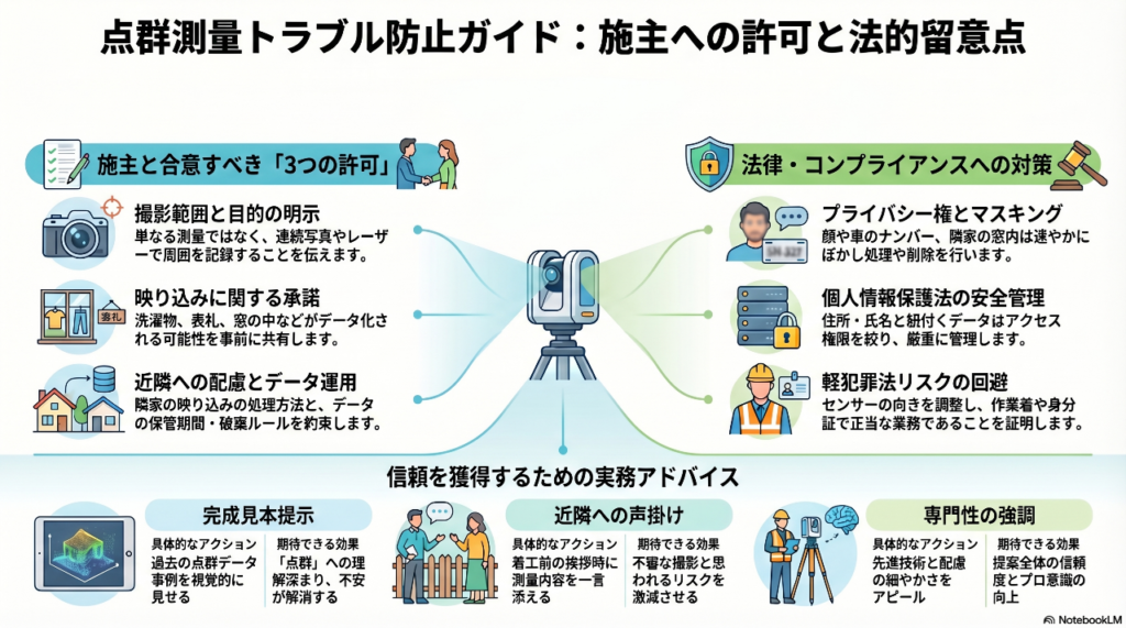 点群データを実務で活用する際は、施主様や近隣への配慮もあわせて重要になります。