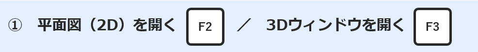 マウスを動かすことなく、左手で、F2キーとF3キーを押すことで、あっという間に、平面図と3Dの切り替えができます。平面図で配置したものを3Dで確認する作業は、作図上とても多いので、繰り返し使うことでかなりの時間短縮が実現します。